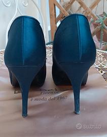 Vendo queste scarpe bellissime in raso blu, tacco alto con plateau, tg. 41. Piccolo difetto su un tacco, come da foto. Per il resto perfette.