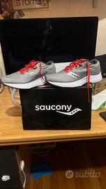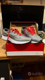 Vendo un paio di scarpe da corsa Saucony, nuove. Sono di colore grigio e rosso, numero 43.