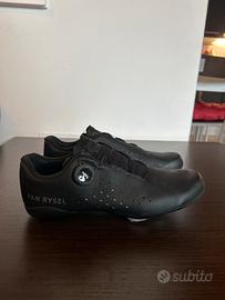 Vendo scarpe da ciclismo Van Rysel nere, taglia 43, utilizzate solamente 4 uscite. Le condizioni sono ottime: tomaia pulita, suola senza usura significativa e sistema di chiusura micrometrica perfettamente funzionante.