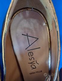(scarpe da donna) Scarpe da donna, vera pelle, colore bronzo, misura 36, plateau 1,5 cm., tacco 9 cm. Fibbia e piccole borchie sopra alle scarpe. Nuove (mai indossate). 6 euro
