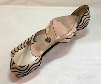 Scarpe donna estive n° 38 di Giorgio Armani in tela beige con inserti di vernice nera, con tacco di 5 cm.