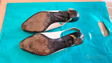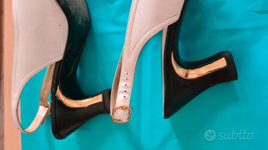 Scarpe in pelle, marca Mab Studio, colore bianco e nero con finitura oro, lavorazione "inglese" sulla punta, tacco da 6 cm.