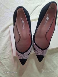 Queste scarpe da donna sono eleganti décolleté a punta con un design raffinato. Sono realizzate in un materiale scamosciato di colore nero, conferendo loro un aspetto sofisticato e versatile. La punta affusolata è impreziosita da un'applicazione di strass scintillanti, che aggiunge un tocco di lusso e glamour.