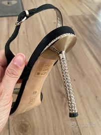 Sandali da donna eleganti in tessuti nero, tacco 11 oro e brillantini. Marca Montenapoleone, numero 40. Usate solo un paio di volte
