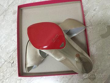 Scarpa da donna nr. 37, color champagne, modello decolte', punta aperta, tacco 11, nuove.