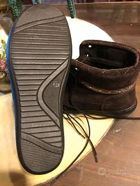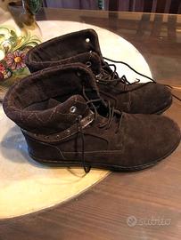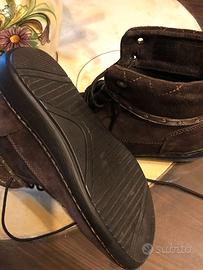 Scarpe da donna polacchine in camoscio color marrone con inserti, tg. 37, made in Italy, intatte, come nuove, solo due volte indossate, la para in gomma e' nuova, senza difetti, tagli, unto, macchie, altro, la confezione e' smarrita.