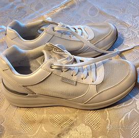 Scarpe da donna Skechers, n. 39. Air cooled Memory foam. Bianche. Le suole sono un po' macchiate (probabilmente asfalto) ma sono pulite. Senza scatola.