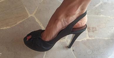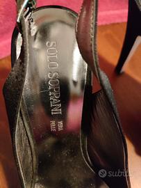 Vendo sandalo elegante da donna con plateau e tacco alto (11,5 cm), aperte in punta in raso nero, misura 38. Fiocco in punta con strass e ciondolo vicino alla fibbia del cinturino. Indossato due volte per sfilate.