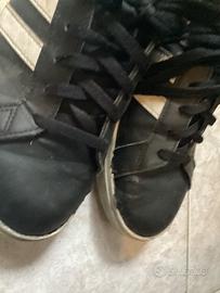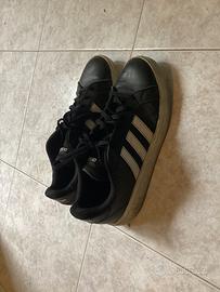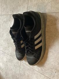 Scarpe da ginnastica Adidas Grand Court nere con le iconiche tre strisce bianche laterali. Presentano segni d'usura come pieghe sulla punta e scuff sulla suola, tipici di un utilizzo regolare. ⭐️ Condizione : 6/10 (segni d'usura visibili) 🎨 Colore : Nero 📦 Spedizione veloce e accurata