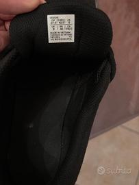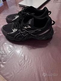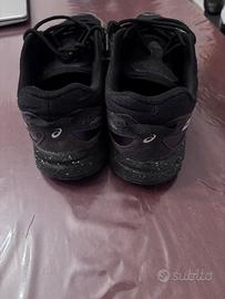Scarpe da ginnastica Asics Gel in nero, usate con lievi segni di usura visibili sulla suola.