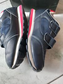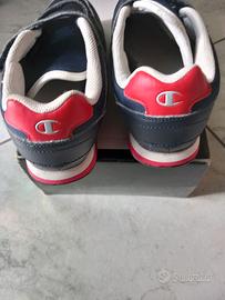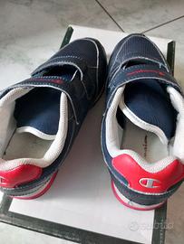 Scarpe da ginnastica in pelle e tessuto, colore blu, marca Champion, con chiusura a strappo, leggere e traspiranti, N. 32. Indossate poco, in perfette condizioni.