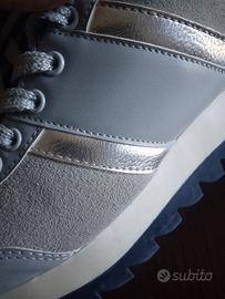 scarpe da ginnastica celesti argentate di Zara Trafaluc.N.36.Inserti in simil pelle ed alcantara.Lacci leggermente argentati che riprendono l argento delle strisce.Usate poche volte.