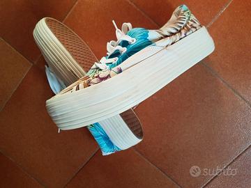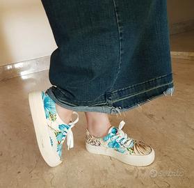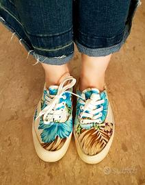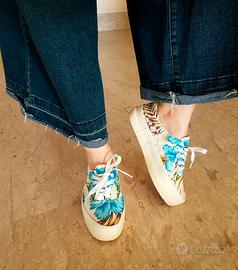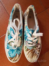 Comode scarpe da ginnastica in tela con una vivace fantasia floreale / tropicale, suola in gomma bianca, n. 38. Design con fiori blu e foglie tropicali. Suola bianca a contrasto. Lacci bianchi. Usate, ma ancora in ottimi condizioni. ☆ Guarda anche gli altri miei annunci e risparmia sulle spese di spedizione. #scarpe #scarpedaginnastica #sportivi #donna #ragazza #bianco #blu #sneakers #estivo #sport #tempolibero #ginnastica #primaverile #fiori #rose #multicolore #tessuto #azzurro #ginnastica #jeans #lacci #cotone #sportive #fiore #turchese #celeste #chiaro #marrone #bianco #sport #sportivi #comode primaverili #estivi #comodi #primavera #estate #motivi #floreali