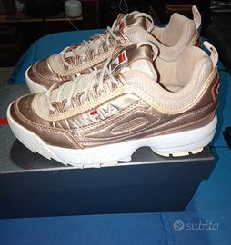 Vendo le scarpe in foto Fila Originali colore oro,precisiamo da donna n41 condizioni e vestibilità buone unico difetto nella ultima foto nella scarpa destra una scalfitura della vernice,internamente ottime.Le foto sono più che nitide.Scarpe similpelle no Plastica come certe avute bianche.Posso spedire con tutto subito costa pochissimo.Buon acquisto no offerte da miserabili le rifiuto,già sono messe a una cifra da ridere.No scatolo buttato,no pelucchi dentro si evince dalla foto.