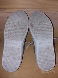 Colore argento: pelle con effetto metallizzato e con perforazioni. Rifinitura in pelle blu al tallone con logo. Suola in gomma rialzata. Misura 38. Indossate in pochissime occasioni. Ben tenute.