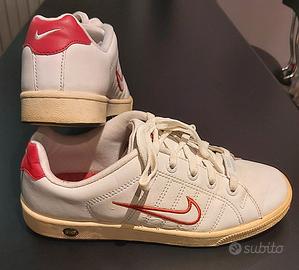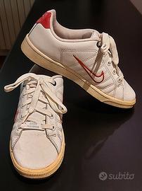 Scarpe da ginnastica unisex, marca Nike, modello Court Tradition. Misura 38. Tomaia in vera pelle di colore bianco, con dettagli in rosso. Suola in gomma antiscivolo e interno in morbido tessuto imbottito. Poco usate, in buono stato.