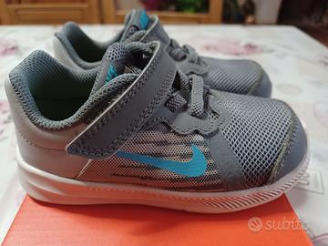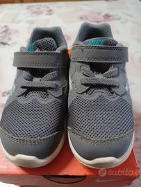 Vendo scarpe da ginnastica NIKE da bambino n. 25, di colore grigio, celeste e bianco, chiusura ad uno strappo e lacci finti.