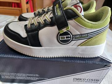 Vendo scarpe da ginnastica ENRICO COVERI ( SPORT WEAR ) da bambino n. 35, verde - bianco - nero, di pelle liscia e pelle scamosciata.