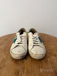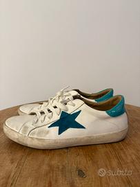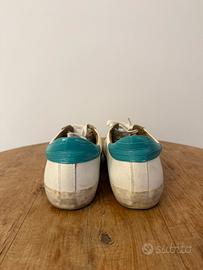 Sneaker per abbigliamento casual Colore bianco effetto usato e apllicazioni color turchese Designer: Giorgia Spagnoletta