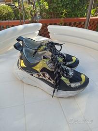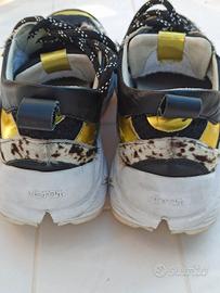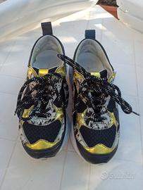 scarpe 36 Scarpe con suola alta da donna con dettagli animalier effetto pelliccia, suola in gomma marca Vibram, chiusura con lacci neri a pois bianchi, colore nero e giallo metallizzato.