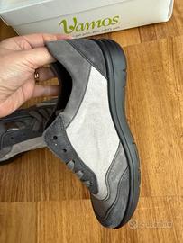 Sneakers VAMOS originali, colore grigio con inserti in diverse tonalità. Realizzate in camoscio e tessuto. Comode e leggere, adatte all’uso quotidiano.