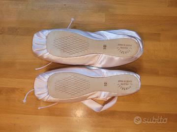 Scarpe da punta per danza classica mis. 10 in raso colore rosa, della ditta Porselli di Milano, specializzata nei prodotti per danza classica.