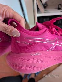 Vendo scarpe da running Asics Gel-Nimbus 25 color rosa scuro intenso/fucsia. Buone condizioni vendo per numero errato 40,5 La Nimbus 25 è nota per la sua tecnologia PureGEL e per l'ammortizzazione FF BLAST PLUS ECO nella suola, che la rendono incredibilmente comoda e reattiva. La Nimbus 25 è nota per la sua tecnologia PureGEL e per l'ammortizzazione FF BLAST PLUS ECO nella suola, che la rendono incredibilmente comoda e reattiva.