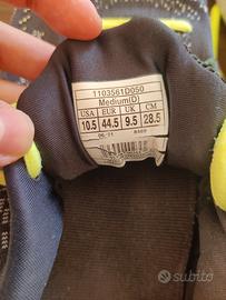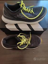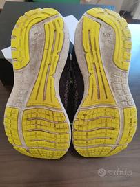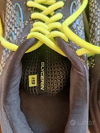 Scarpe da running Brooks Glycerin 19. Colorazione scura (grigio/viola scuro) con accenti vivaci color giallo fluo (lacci e suola). Taglia 44,5. Le scarpe sono usate e mostrano normali segni di usura. Le suole presentano un consumo visibile della gomma colorata ma offrono ancora una buona trazione (KM PERCORSI 580). La tomaia è in buone condizioni generali. Nota Bene: Come visibile in una delle foto dettagliate, è presente un piccolo strappo nel rivestimento interno in tessuto del tallone della scarpa sinistra. Questo difetto estetico non compromette l'utilizzo della scarpa. NON C'È LA SCATOLA ORIGINALE.
