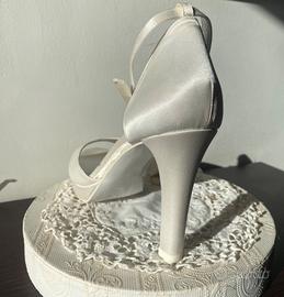 Raffinata scarpa da sposa in raso , modello sandalo, realizzata da un atelier di abiti da sposa e cerimonia: La Vie En Blanc Atelier RomaTacco alto da 10 cm con plateau da 3 cm, per un effetto slanciato ma comodo.Cinturino alla caviglia, fascia anteriore in raso lucido e calzata regolare e confortevole.Perfetta per completare un abito da sposa o un look da cerimonia elegante.