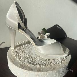 Raffinata scarpa da sposa in raso , modello sandalo, realizzata da un atelier di abiti da sposa e cerimonia: La Vie En Blanc Atelier RomaTacco alto da 10 cm con plateau da 3 cm, per un effetto slanciato ma comodo.Cinturino alla caviglia, fascia anteriore in raso lucido e calzata regolare e confortevole.Perfetta per completare un abito da sposa o un look da cerimonia elegante.