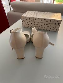 Scarpe da sposa beige in vera pelle (Alfonso Garlando Milano), realizzate a mano, misura 39, tacco 9 cm, punta quandrata. Comode ed elegantissime.