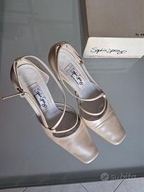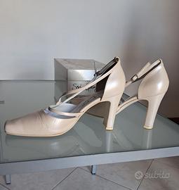 Le scarpe presentano qualche piega dovute al fatto di averle indossate tutto un giorno. L'interno è pulito. La suola chiaramente risulta usata. Dopo il matrimonio non sono state più usate, a causa del colore perlato che non si abbina al mio abbigliamento usuale.
