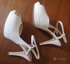 Sandalo bianco in pelle e stoffa glitterata, N. 36, tacco 10 cm, plateau 2 cm. Laccetto a caviglia.