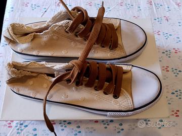 Scarpe da tennis in cottone con motivi a pois et bordo a macrame N. 38 (vestono 37/5) Nuovi mai indossati molto comodi.