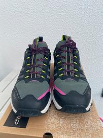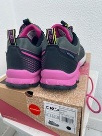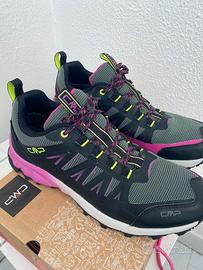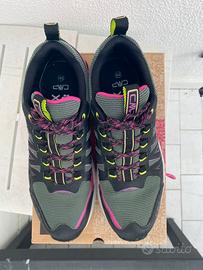 Scarpe utilizzate per pochi giorni. Scarpe da trekking da donna CMP LAKY WMN FAST HIKING SHOES WP. LAKY WP è un modello pratico e leggero, adatto a escursioni veloci su terreni misti e fangosi: leggerezza, reattività e stabilità sono le caratteristiche principali di questa scarpa. La tomaia dinamica in mesh con rivestimento in PU garantisce un'ottima calzata. La membrana Climaprotect garantisce l'impermeabilità. La soletta rimovibile Ortholite X35 offre un ritorno di energia dal 35% al 25% e aumenta il comfort. Tra l'intersuola e la soletta è stato inserito un inserto termoplastico che offre una migliore protezione contro le irregolarità del terreno senza compromettere la flessibilità durante il rullata del piede. La suola in gomma con mescola CMP FullOnGrip garantisce aderenza.