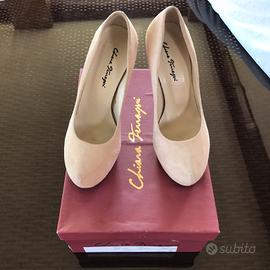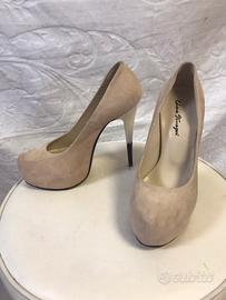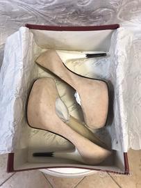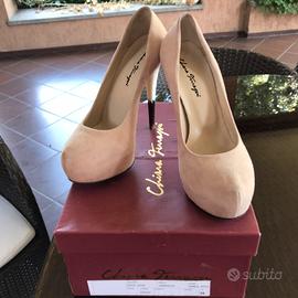 Vendo come nuove messe un paio di volte, magnifiche scarpe décolleté disponibili Nr.36 e Nr.37 con scatola, di color cameo rosa scamosciate originali CHIARA FERRAGNI, con tacco osso a spillo 13 cm. bianco e nero, interno in pelle e suola di cuoio, plateau 3 cm.