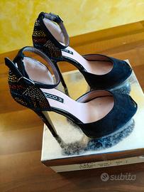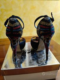 Vendo scarpe décolleté con brillantini colorati tacco 14 cm con plateau di 2cm davanti, materiale : camoscio e vernice nera.Numero 37.Marca: Blocco 31.
