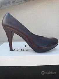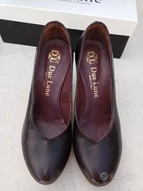 scarpe décolleté tacco 10 con plateau, in pelle color prugna Elegantissima, scarpa in vera pelle colore prugna con plateau e tacco alto 9-10 cm, Indossata pochissimo, nuova e in ottime condizioni, questa décolleté in vera pelle è 100% madeinitaly prodotta con tecniche artigianali in laboratorio del distretto calzaturiero delle Marche. Di pelle anche la suola e la calzata interna. Veste 36 molto giusto, no 36,5. Scatola originale in foto