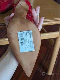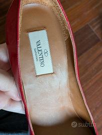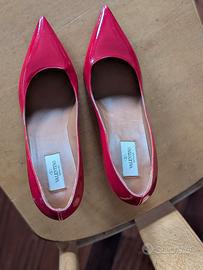 Vendo scarpe decolleté con tacco, in pelle verniciata colore rosso, originali di Valentino Garavani. Taglia 41. Ricevute in regalo, le ho provate ma mai utilizzate come si vede dallo stato delle suole, perché non gradisco le scarpe a punta.