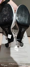 Scarpe décolleté, eleganti, della "Melluso", color Argento, misura 41, con plateau di quasi 2 cm. ed il tacco che misura cm. 7,5 ca. Le scarpe sono in ottimo stato perché indossate poche volte, a causa dei miei problemi alla schiena : l'unico piccolo difetto è una piccola macchia nel plateau interno della scarpa sinistra, come si può vedere in foto. La scatola dove sono conservate è quella originale.