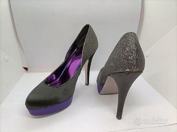 Scarpe donna numero 39 sono décolleté con plateau di marca Alesya, caratterizzate da una tomaia in raso nero e glitter, un plateau viola e un tacco alto.