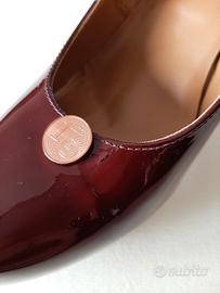 Scarpe con tacco da donna realizzate in pelle con finitura lucida, la suola è in materiale sintetico.