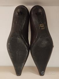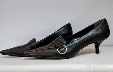 Scarpe décolleté eleganti Sergio Rossi a punta leggermente squadrata/allungata in pelle marrone scuro con una caratteristica fibbia laterale metallica. Taglia 38
