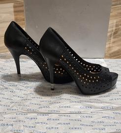Bellissime scarpe originali Guess in vera pelle nera con raffinata lavorazione traforata. Usate una sola volta per un evento, sono in condizioni eccellenti.