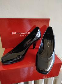 Scarpe décolleté in vera pelle verniciata, nera. Misura 36, tacco 7, suola cuoio. Rossellina