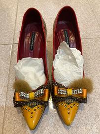 Scarpe décolleté marca Mario Bologna Gloss con inserti in pelliccia e fiocchetti di strass, numero 40. Altezza tacchi 5 centimetri. Consegna a mano zona Ponte Milvio.