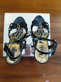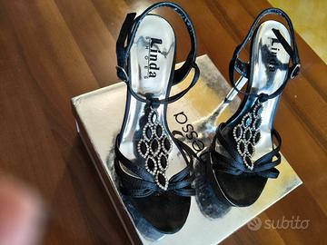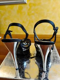 Vendo scarpe décolleté nere in raso con rombo di pietre Swarovski e brillantini in ottime condizioni tacco 14cm in colore argento con plateau davanti di 3cm , come si vede in foto.