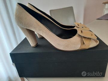 Vendo eleganti scarpe décolleté aperte sulla punta in vera pelle scamosciata, colore beige con fibbia, tacco 8cm, made in Italy marca Anna F.