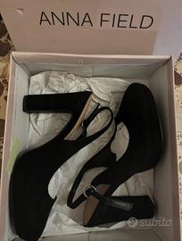 Vegan scamosciate nere con cinturino al tallone regolabile. Nuove, senza cartellino. Complete di imballaggio e scatola originale. Indossate solo in casa per provarle.