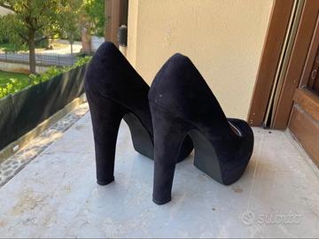 Scarpe décolleté nere scamosciate con plateau, tacco 13 cm e soletta in pelle.